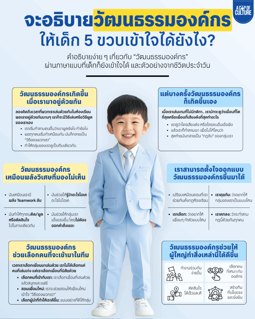 เวลาผู้ใหญ่คุยกันเรื่อง “วัฒนธรรมองค์กร” เคยสงสัยไหมครับว่า.. ถ้าจะให้ลูกน้อยวัย 5 ขวบเข้าใจเรื่องนี้ เราจะอธิบายเรื่องที่ดูซับซ้อนอย่างวัฒนธรรมองค์กรให้ลูกเข้าใจได้อย่างไร ในฐานะที่ปรึกษาด้านการสร้างวัฒนธรรมองค์กร จากประสบการณ์ที่เราได้ทำงานเรื่องนี้ เราจึงสรุปคำอธิบายง่าย ๆ สนุก ๆ เกี่ยวกับ “วัฒนธรรมองค์กร” ว่าคืออะไร – ผ่านภาษาที่เด็กเข้าใจได้ และตัวอย่างจากชีวิตประจำวัน