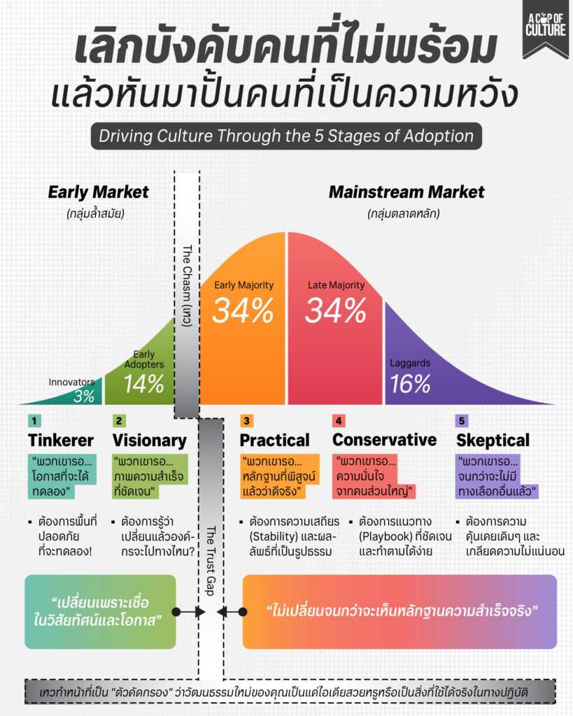 - กลยุทธ์: โชว์ “Quick Win” ให้เขาเห็นบ่อยๆ การเปลี่ยนวัฒนธรรมไม่ใช่เรื่องเพ้อฝัน แต่ต้องมี Case Study จริงในแผนกข้างๆ มายืนยัน เมื่อกลุ่มนี้เริ่มขยับ นั่นคือจุดที่องค์กรเกิดการเปลี่ยนแปลงอย่างแท้จริง