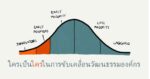 ภาพ Adoption Curve ของ Everett Rogers (ถึงแม้จะถูกคิดค้นมานานแล้ว ตั้งแต่ปี 1962 แต่ในยุคที่เทคโนโลยีเปลี่ยนเร็วอย่างตอนนี้ มันกลับมีแง่มุมที่ยังใช้งานได้จริงอยู่!) เส้นโค้งนี้กำลังบอกความลับที่สำคัญกับเราว่า: คนไม่ได้ปฏิเสธการเปลี่ยนแปลง แต่เขาแค่ต้องการ “เหตุผล” และ “จังหวะเวลา” ที่ต่างกัน