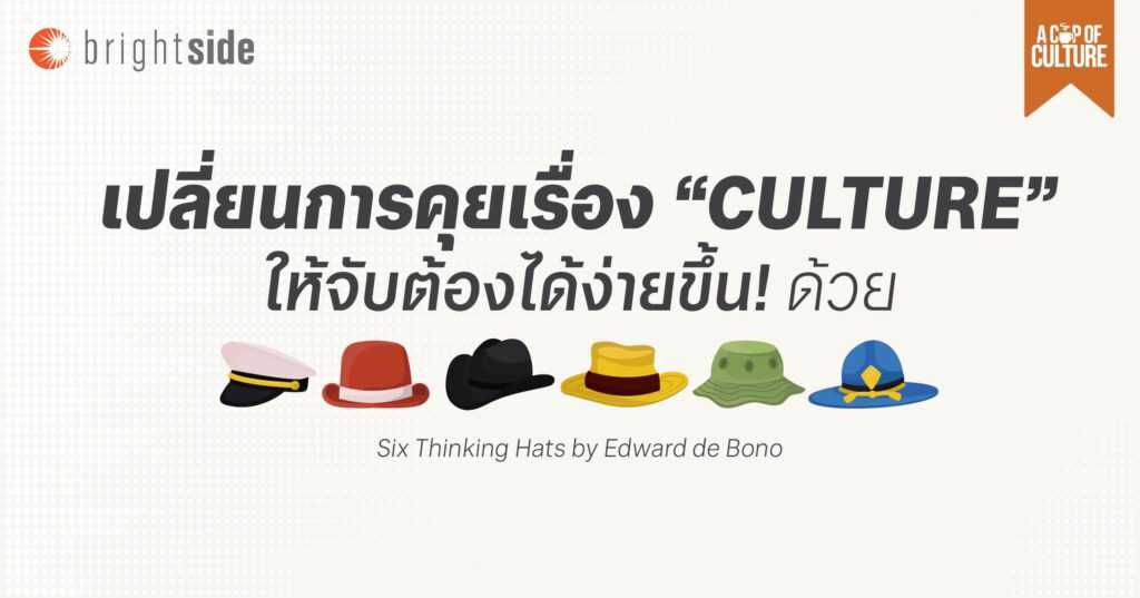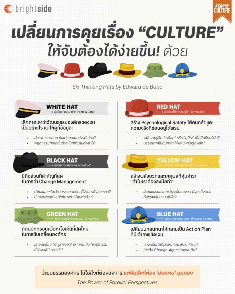 นี่คือบทบาทของ Six Thinking Hats หรือ หมวกคิด 6 ใบ ของ Edward de Bono ที่จะเข้ามาเปลี่ยนการคุยเรื่องวัฒนธรรมองค์กรให้เป็นระบบมากขึ้น