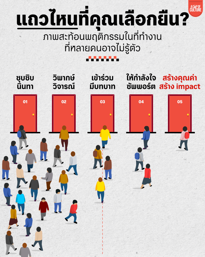 ทุกวัน…เรากำลังเลือกยืนอยู่ในแถวไหน? กิจวัตรในที่ทำงานที่เราทำกันเป็นประจำ เริ่มตั้งแต่เวลาเข้างาน พูดคุยกับเพื่อน (+เม้าท์มอย) เปิดคอมเช็คโซเชียล เคลียร์งานด่วนงานเร่งที่เข้ามาแบบไม่ทันตั้งตัว หรือการวิ่งวุ่นอยู่กับการเข้ามีตติ้งตลอดทั้งวัน… อาจดูเป็นเรื่องปกติ แต่พฤติกรรมเล็กๆ เหล่านี้กำลังก่อร่างสร้าง “วัฒนธรรมองค์กร” โดยที่หลายคนอาจไม่ทันรู้ตัว