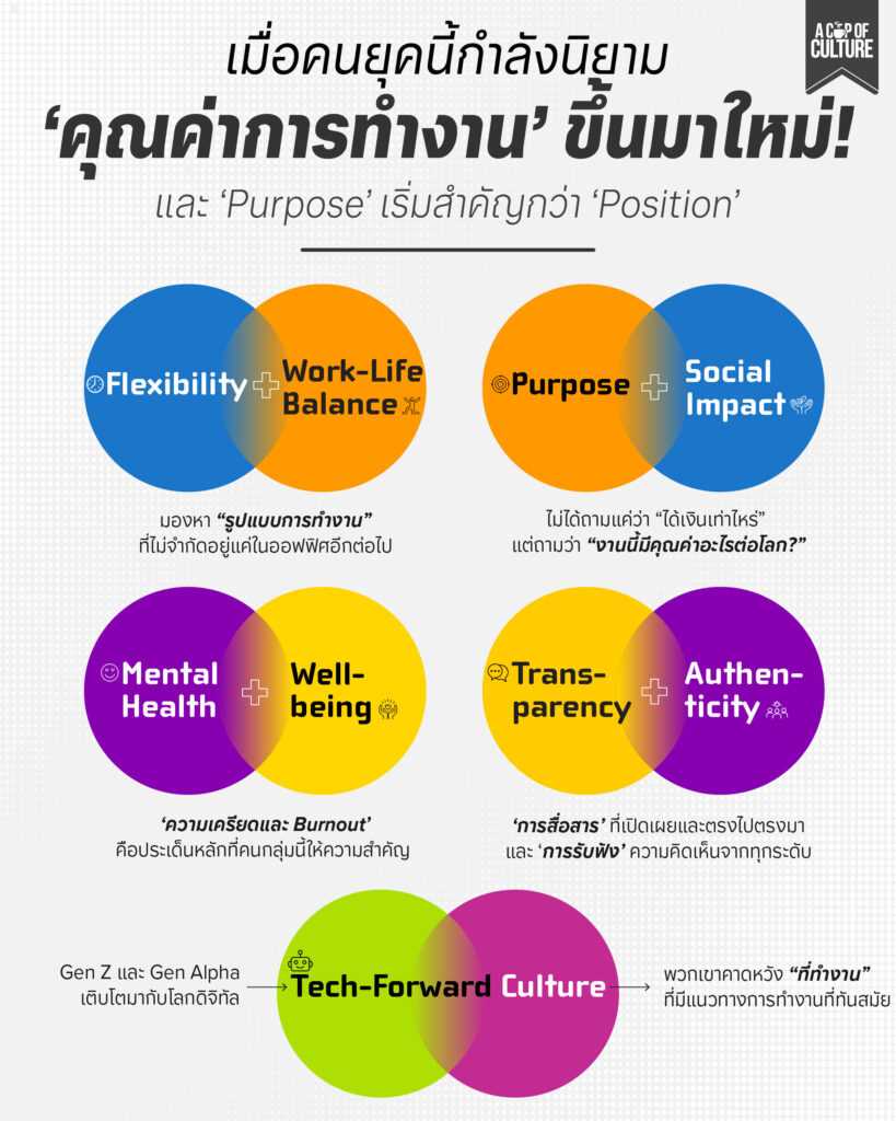 คนเหล่านี้ไม่ได้มองหางานเพียงเพื่อ “ความมั่นคง” เหมือนในอดีต แต่พวกเขามองหา “ความหมาย” “ความสมดุล” และ “ประสบการณ์” ที่สอดคล้องกับชีวิตของตัวเอง ดังนั้นองค์กรที่ต้องการเติบโตอย่างยั่งยืน จำเป็นต้องเข้าใจและปรับวัฒนธรรมองค์กรให้ตอบโจทย์ความคาดหวังใหม่เหล่านี้