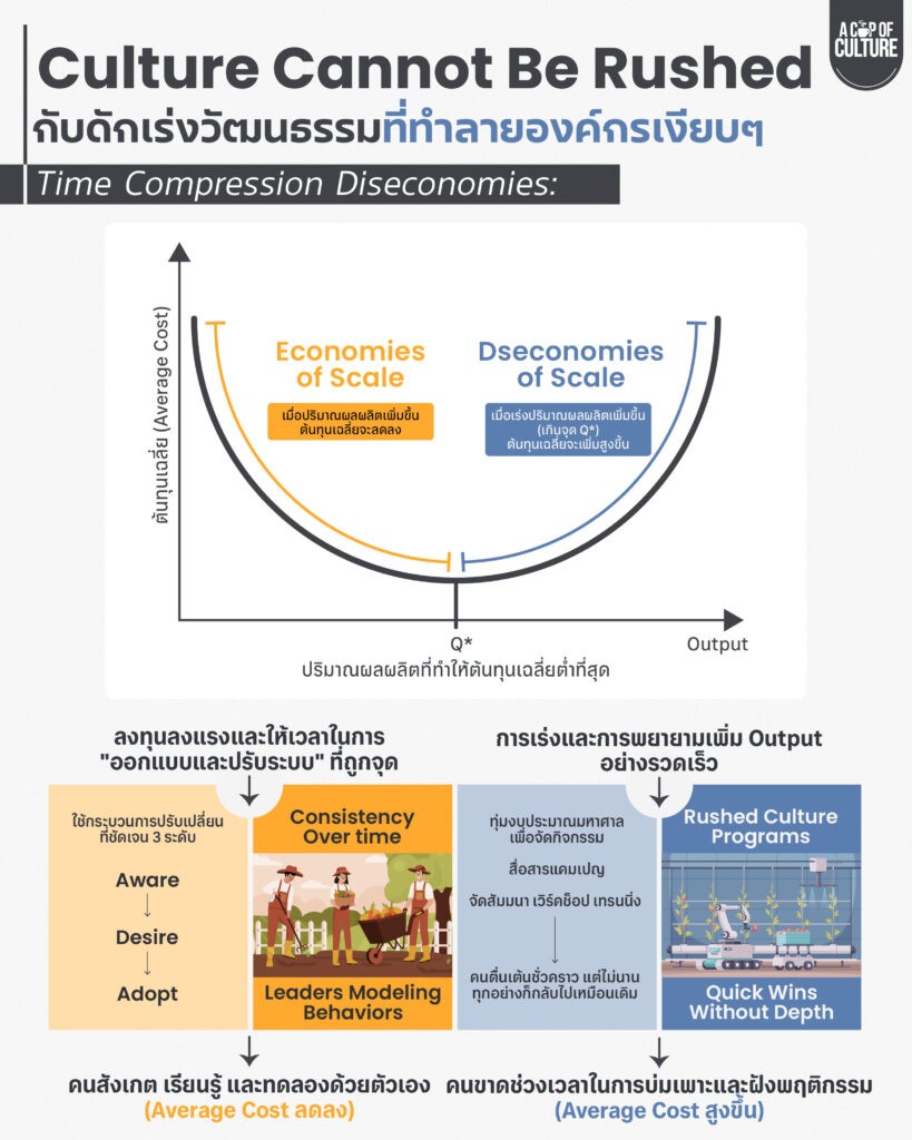 Time Compression Diseconomies จึงเป็นหลักเตือนใจสำคัญสำหรับผู้นำองค์กรยุคนี้ว่า “บางอย่างยิ่งเร่ง ยิ่งช้า” วัฒนธรรมองค์กรคือหนึ่งในนั้น เพราะมันเกี่ยวข้องกับมนุษย์ — กับความรู้สึก ความเชื่อ ความสัมพันธ์ และความไว้วางใจ ซึ่งทั้งหมดนี้ต้องใช้เวลาในการปลูก ไม่สามารถเร่งให้ผลออกเร็วขึ้นได้เหมือนสายการผลิต