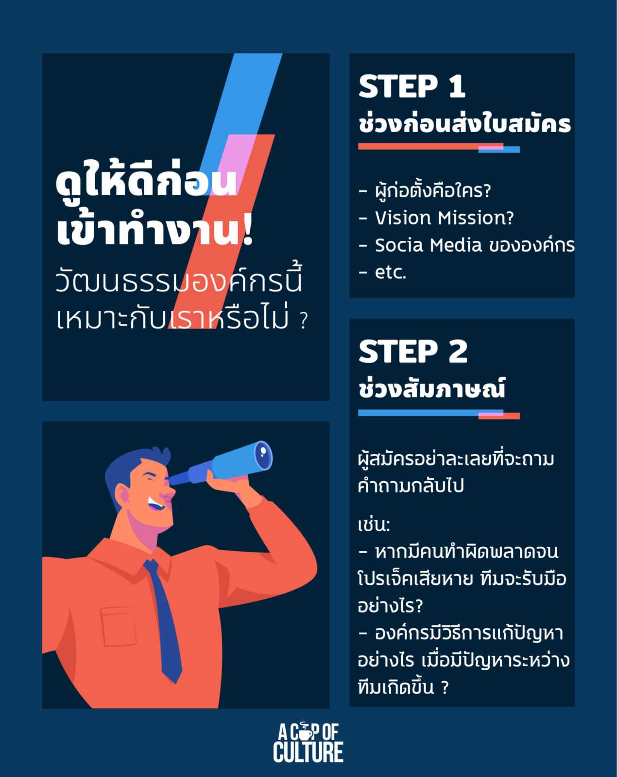 ในช่วงที่การหางานยากนี้อาจจะมีหลายคนที่กำลังกังวลกับการหางาน จนอาจจะลืมไปว่าความลงตัวคือนอกเหนือจากที่องค์กรจะเลือกเราแล้ว เราต้องเลือกองค์กรด้วย แต่เราจะรู้ได้อย่างไรว่าองค์กรนี้เหมาะกับเรา ทั้งในด้านของวัฒนธรรมองค์กร หรือด้านของความสามารถ และถ้าท่านกำลังอยู่ในสถานการณ์ที่อาจจะกำลังมองหางานใหม่ หรือกำลังจะไปสัมภาษณ์วันนี้เรามีตัวช่วยมาฝาก